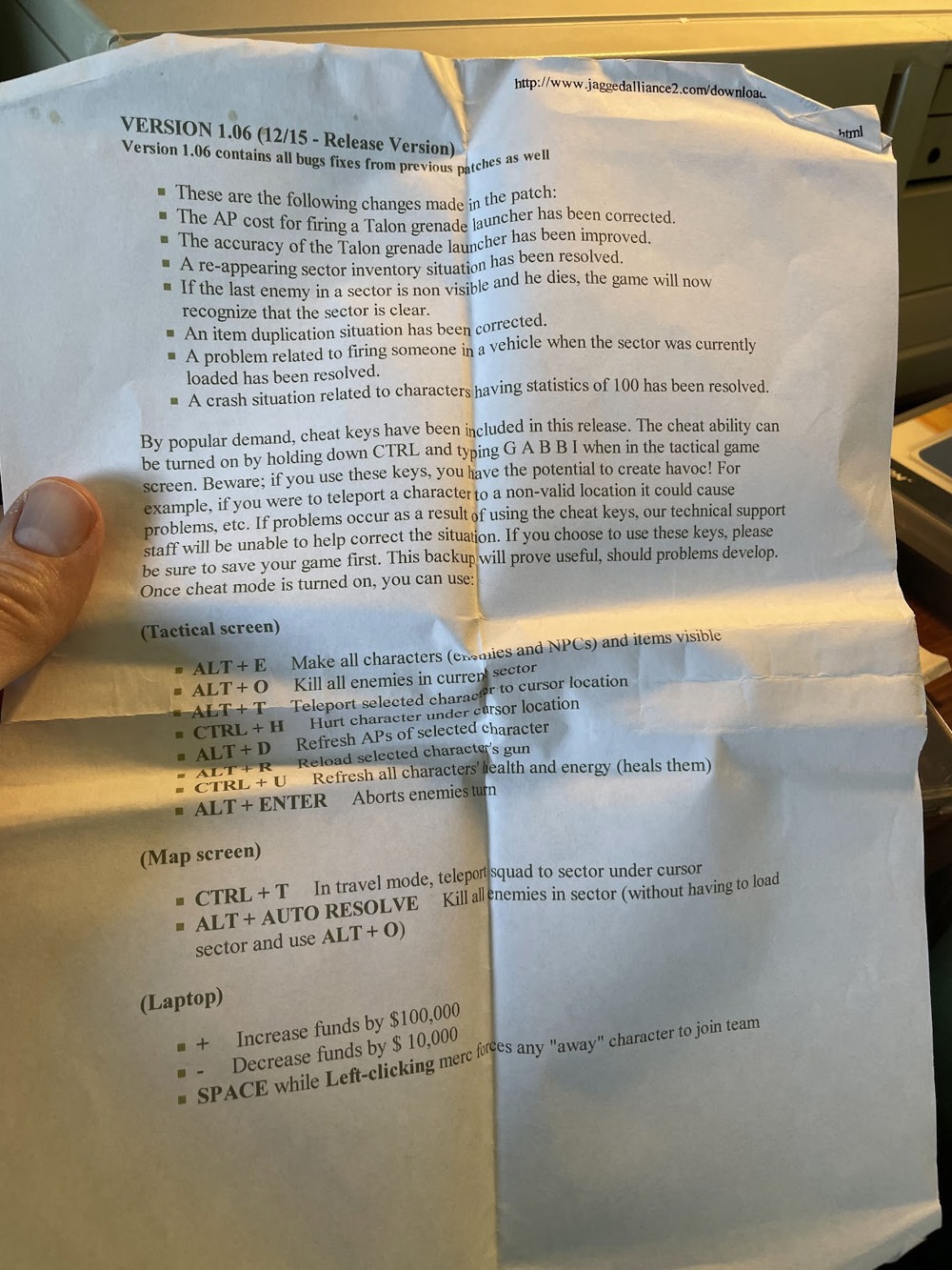 In this case I had a copy of the Jagged Alliance 2 patch that would enable cheat codes on my modern machine, but was limited in how I'd be able to transfer it across.