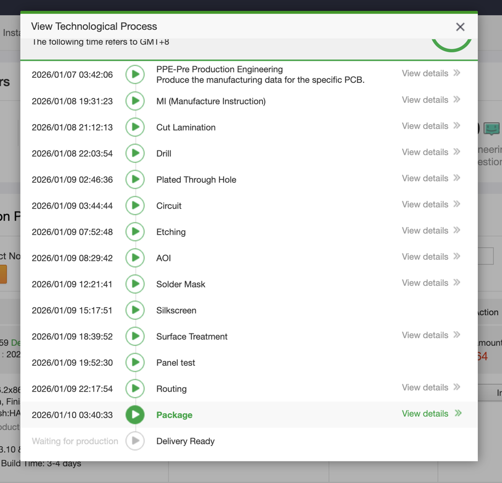 After that we were off to the races! By that I mean, it was all over to PCBWay to manufacture the boards. One of the great things about PCBWay is that they give you very granular progress during the whole manufacturing process, so that you're able to log into the website and see exactly what stage they are at.